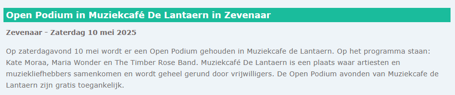 Op zaterdagavond 10 mei wordt er een Open Podium gehouden in Muziekcafe de Lantaern. Op het programma staan: Kate Moraa, Maria Wonder en The Timber Rose Band.